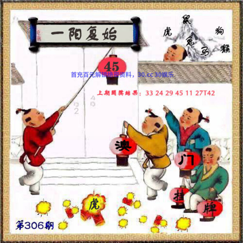 | 306期挂牌《一阳复始》 解释:指冬至日阴气尽,阳气又开始发生,象征春天到来。 解料:阳气。解阳肖牛虎兔羊猴鸡,挂:45爆:虎。 七肖:虎鸡牛兔羊猴马 |