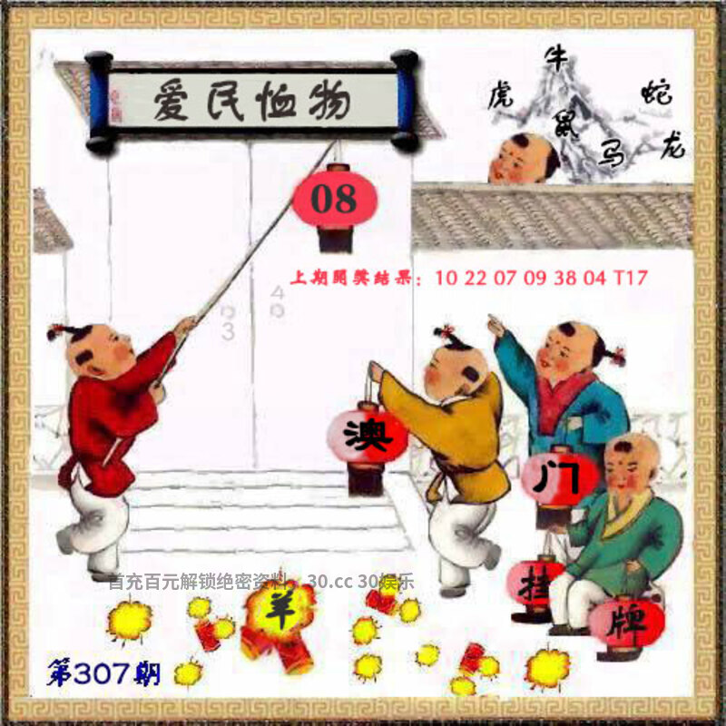 | 307期挂牌《爱民恤物》 解释:该成语更侧重对百姓生存状态的深切关怀。 解料:对百姓生存状态的深切关怀。解狗猴兔羊虎鼠,挂:08爆:羊。 七肖:羊狗猴兔虎鼠鸡 |
